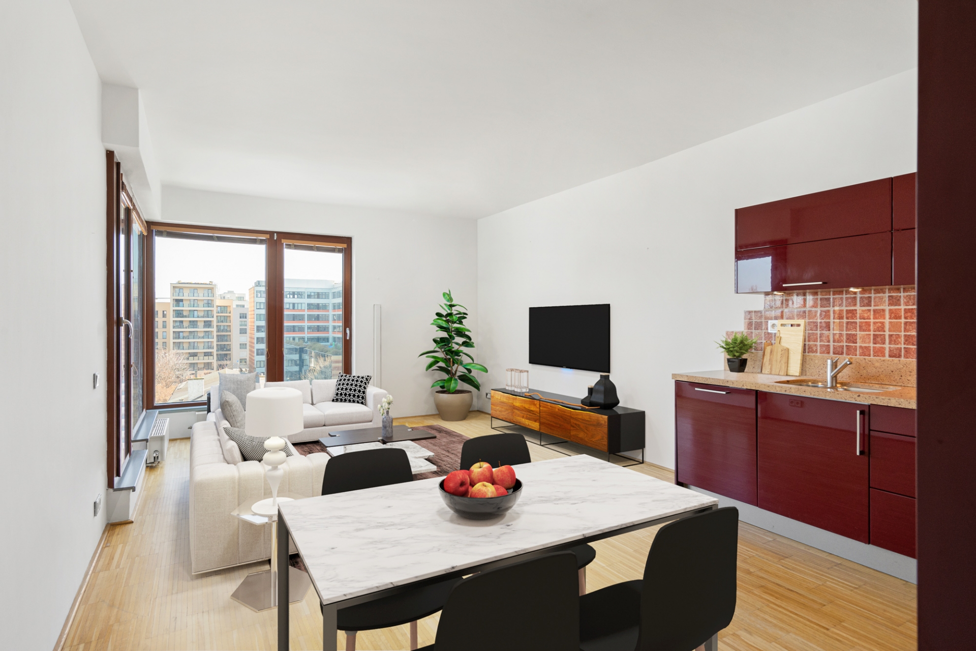 Velmi komfortní byt v rezidenčním komplexu River Diamond, 2+kk, 67 m2, v 5. patře, obývací pokoj s plně vybavenou kuchyňskou linkou, 1x ložnice, koupelna s vanou a sprchovou zástěnou, samostatná toaleta, na podlahách parkety a dlažba, vstup na balkon 2,5 m2 z obou místností, v chodbě a ložnici vestavné skříně, internet, cabel tv, velký sklep 8 m2 (započítáno do podlahové plochy bytu). Možnost koupě až 2 parkovacích stání v podzemní garáži. Nadstandardní projekt s 24 h recepcí, japonskou zahradou ve vnitrobloku. Mimořádná lokalita dynamicky se rozvíjejícího Karlína, s veškerou občanskou vybaveností, nespočtem kvalitních restaurací a kaváren, cyklostezkou u domu a budoucí lávkou s propojením do Holešovic a na Štvanici, jen 5 minut od centra Prahy, metro Křižíkova pouhých 250 metrů. Kvalitní byt, komplex i lokalita. Doporučujeme!