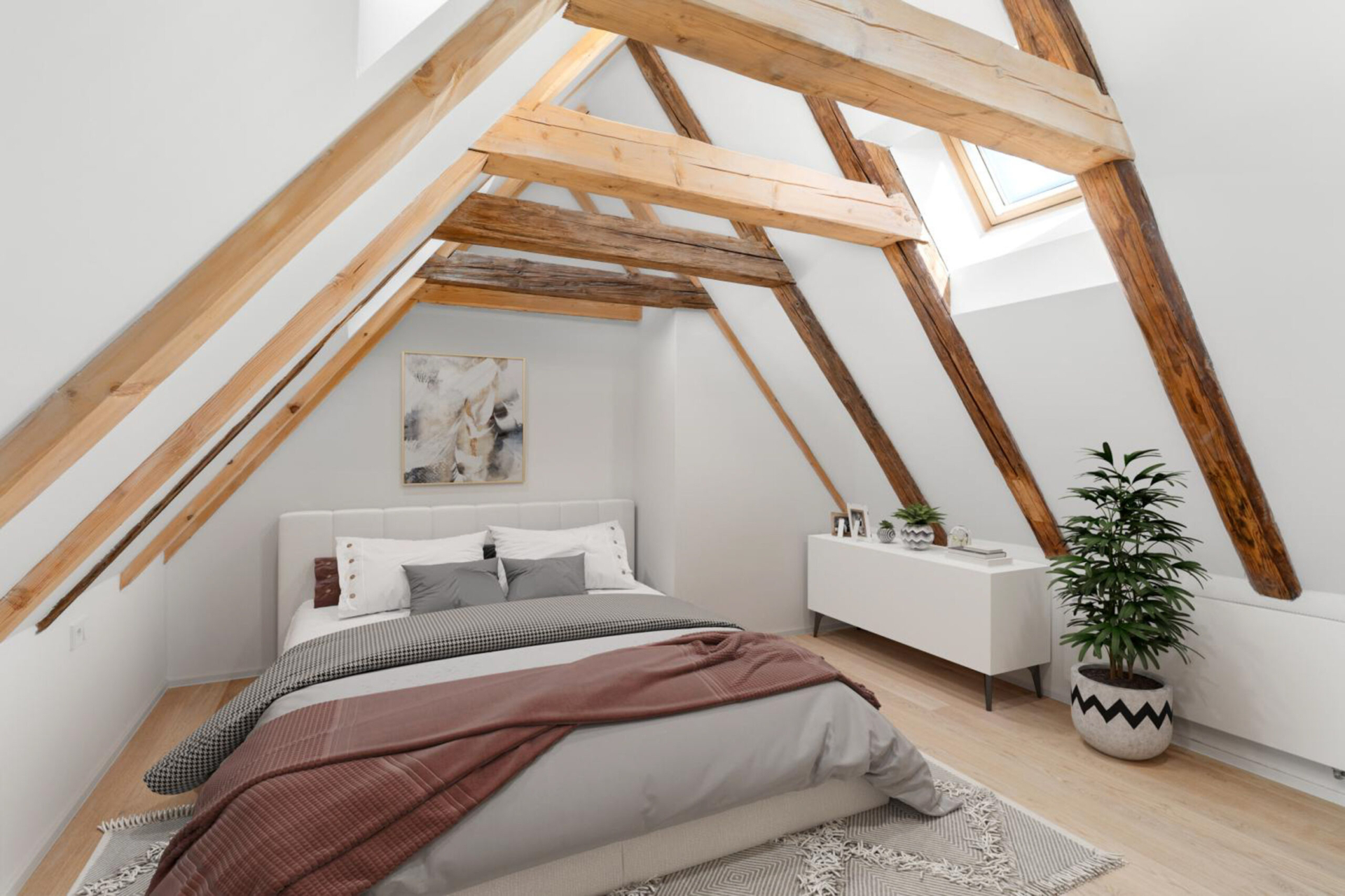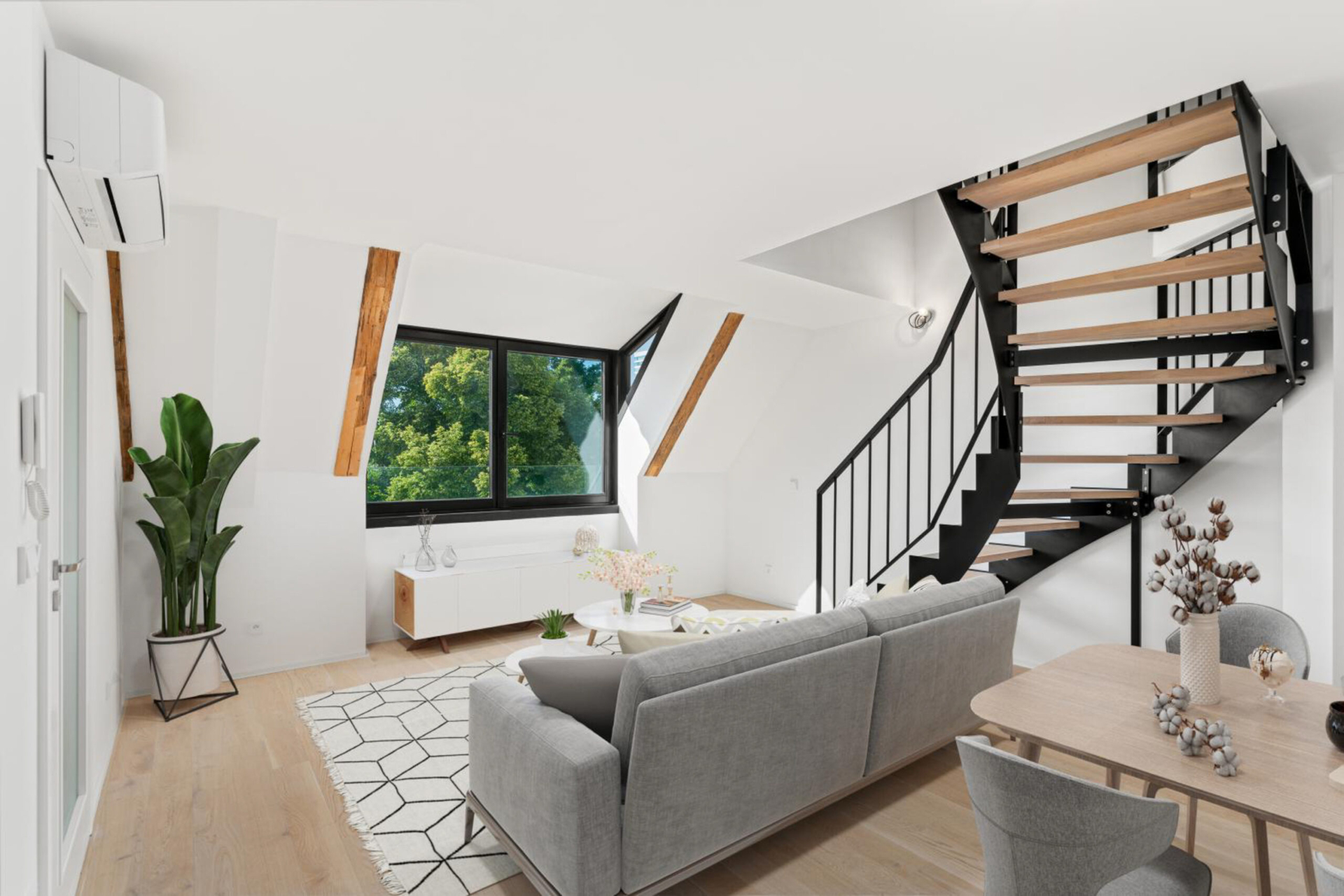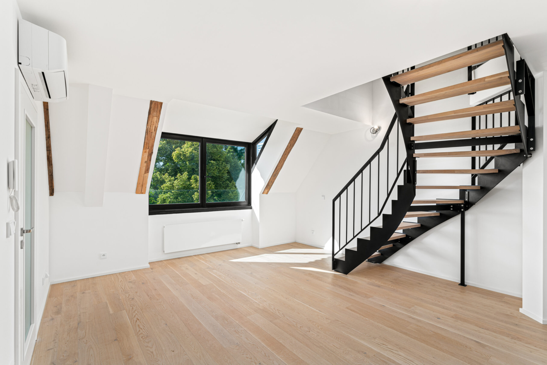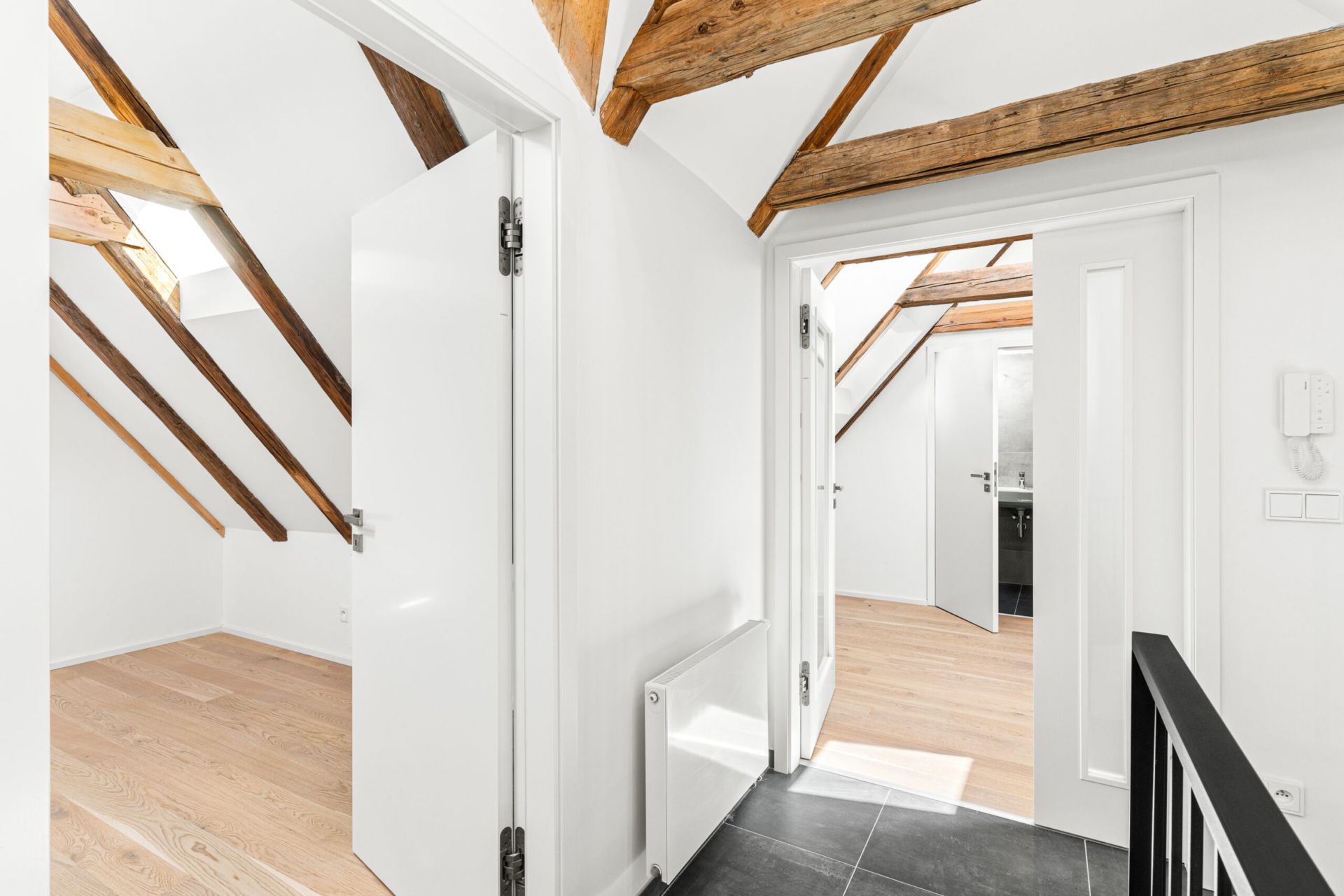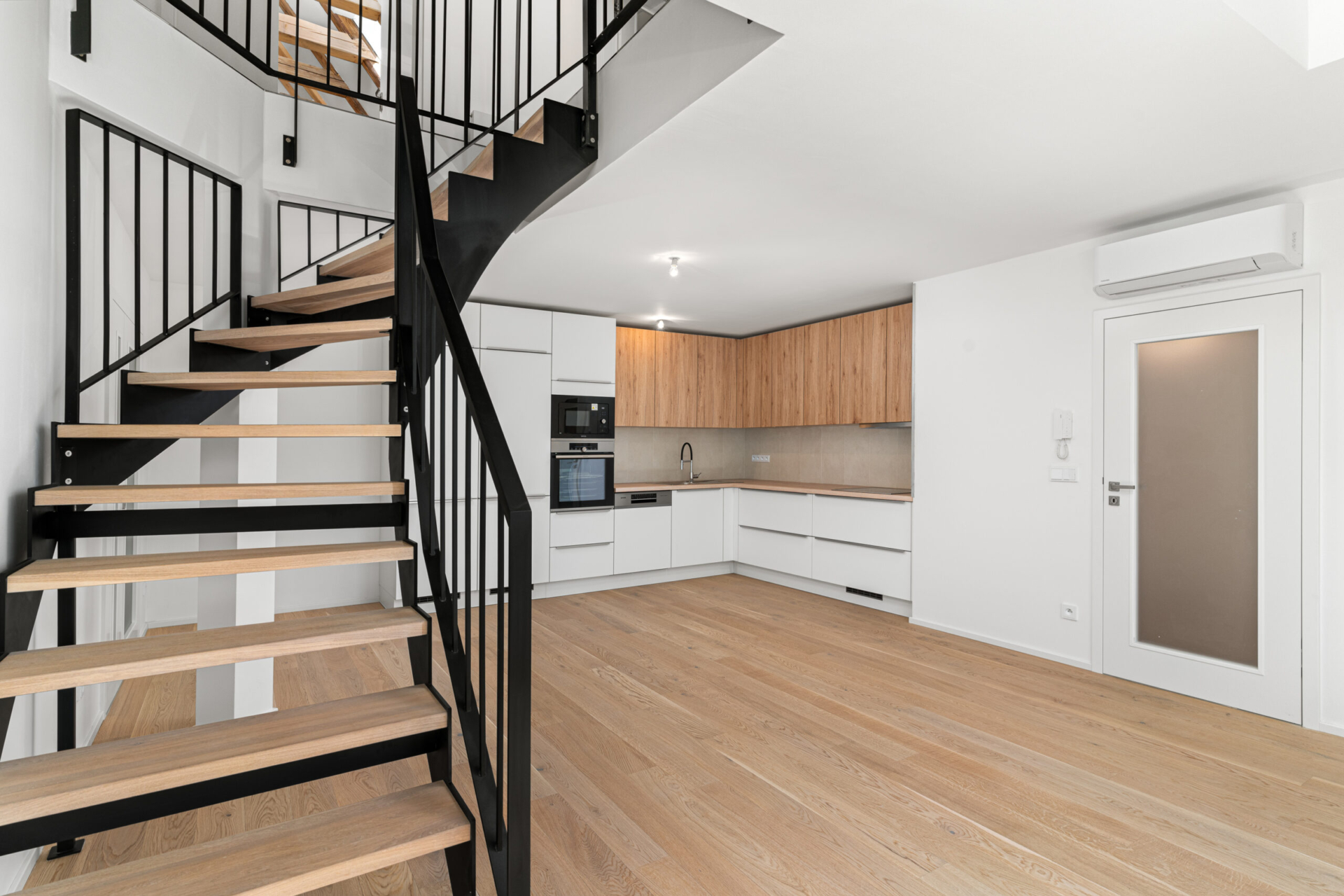 The apartment is equipped with the latest modern features without losing its historical charm, empowered by omnipresent wooden elements ? floors, stairs, and beams. You will be welcomed by an entrance hall with a convenient restroom and a lavatory with a bath. The living room, boasting a generous size of 32 square meters, features a fully furnished kitchenette in light colors combined with wood accents. Then, you can enter one of the two rooms on this level, which can serve as either a bedroom, an office, or a guest room.
