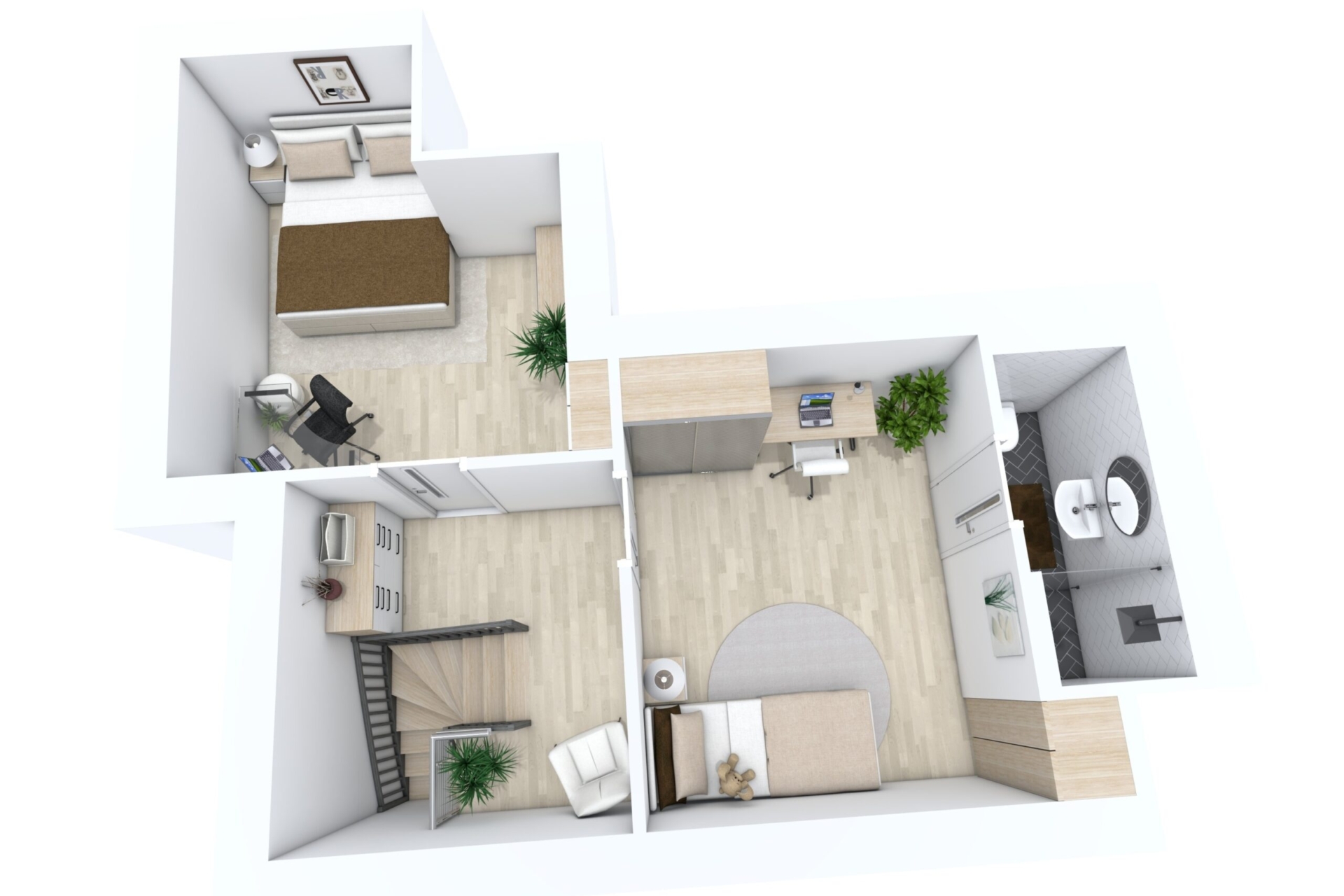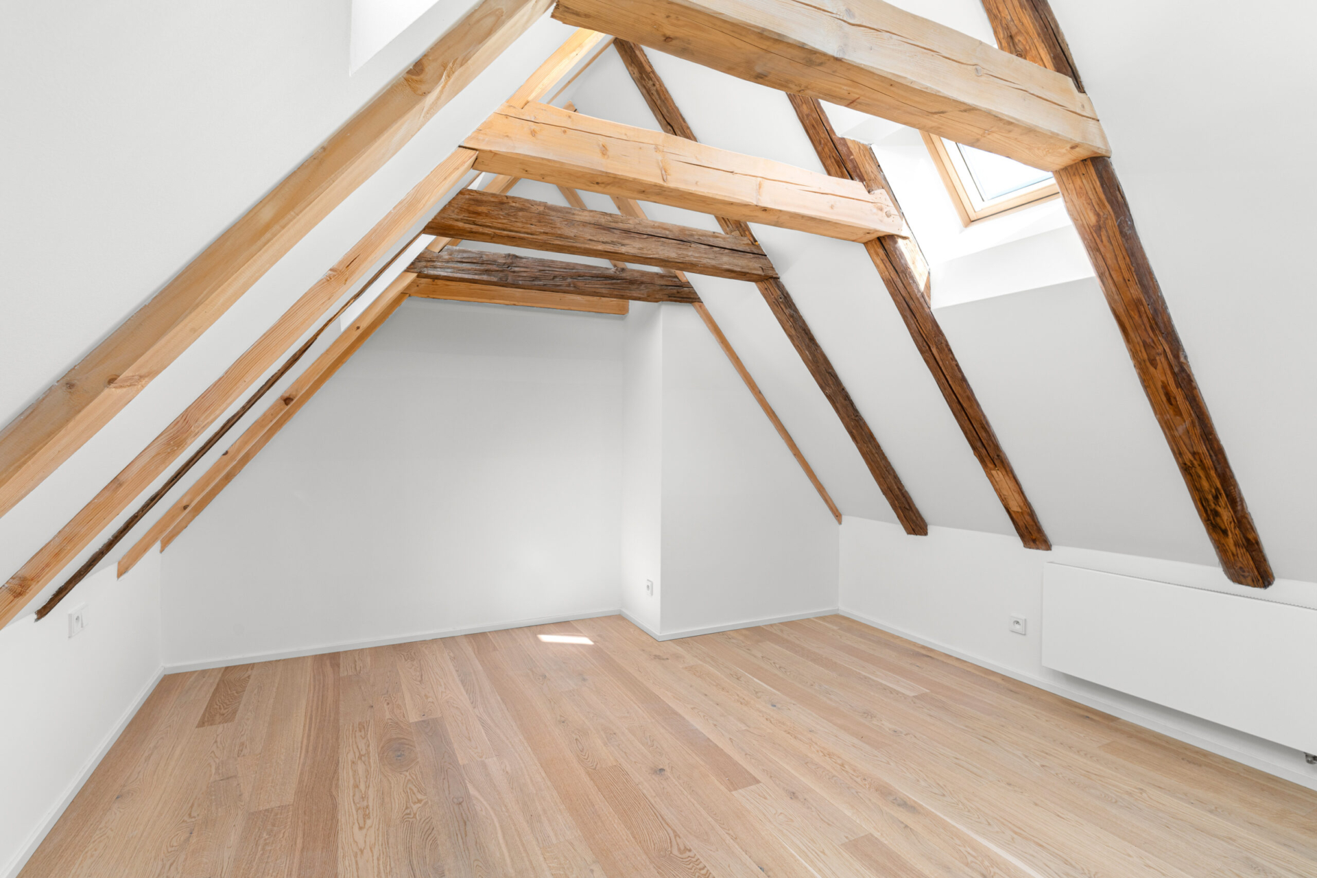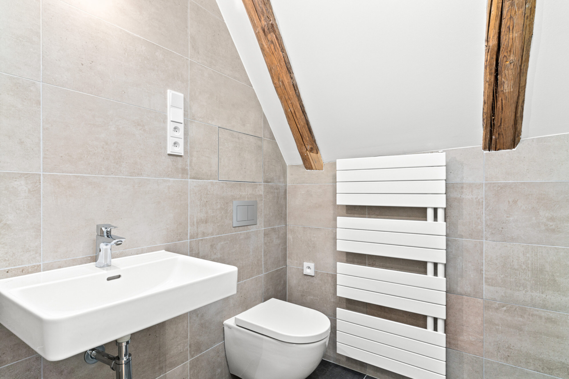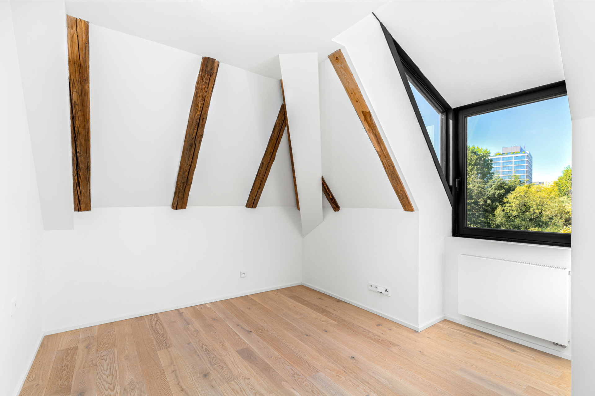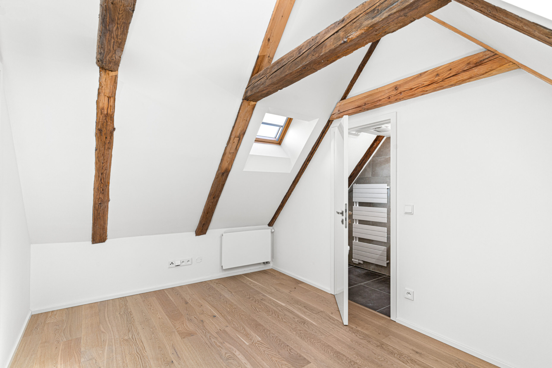 The apartment is equipped with the latest modern features without losing its historical charm, empowered by omnipresent wooden elements ? floors, stairs, and beams. You will be welcomed by an entrance hall with a convenient restroom and a lavatory with a bath. The living room, boasting a generous size of 32 square meters, features a fully furnished kitchenette in light colors combined with wood accents. Then, you can enter one of the two rooms on this level, which can serve as either a bedroom, an office, or a guest room.